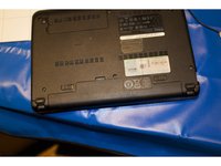 • Step 1 — Hard Drive Turn the device over so that the back (white side) of the device is facing up. Remove battery from laptop by pushing the two tabs outward and pull the battery outward. The tabs are highlighted in blue. Place the battery off to the side. .