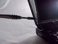 Lift the adhesive flap from the cord that connects the computer to the screen.