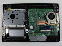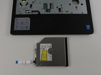 With the laptop facing upright - remove the ribbon cable from the optical drive by lifting the white release tab and gently pulling the cable away from the socket.
