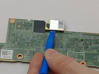 Once the motherboard is removed, place on a flat surface facing down. Use the plastic opening tool to disconnect and remove the camera from the motherboard.