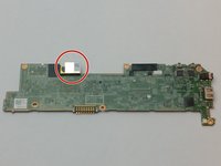 Rotate the motherboard upwards from the tablet using tweezers, but do not remove completely from the device. As you lift, disconnect the black and red wire located underneath the motherboard before removing it completely from the tablet.
