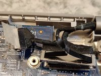 CMOS battery is stuck to frame with glue. The last cable goes to the keyboard that is hard mounted to the frame as well.