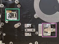 The last parts we need to remove are the small bridging board between power button and extension board (green rectangle) as well as the ssd bracket (pink rectangle). The bridging board is easily removed by using a spudger and the bracket is removable by pushing it down.