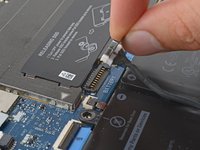 Grab the black pull tab on the head of the battery connector and pull straight up to disconnect it.