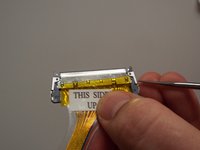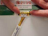 The ribbon cable at the top of the screen uses a locking connector. Gently squeeze the levers on each side to release the lock and tug the ribbon cable down towards the bottom of the screen.