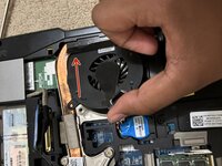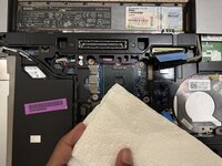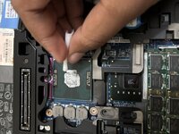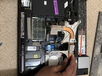 In the unverified new version, I added the steps to replace the thermal paste. The loud noise might be a bad fan bearing. Download HWMonitor to see the CPU temps. If its over 50 idling, and 70 doing any work, you might want to try new thermal paste, or clean or replace the fans and paste. The chip to the right of the CPU is usually the GPU, marked nVidia if you have the Quadro Model, and there is a chip under the CPU which I do not know the function of.