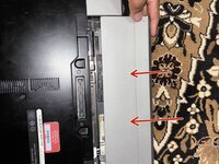 Flip the laptop over, and push the two tabs shown in the photo inwards until it clicks. push battery upwards away from laptop to remove battery.