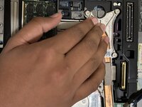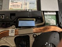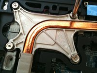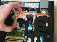 Disconnect the blue connector near the top right screw of the heatsink (display cable, circled in red) by pulling on the blue tab gently. Gently push and/or tape the cable to the chassis away from the heatsink.