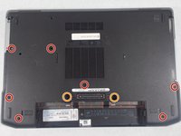 Using the screwdriver, remove seven 4mm Phillips #1 screws from the bottom of the laptop.