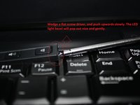 Locate the small LED indicator panel found on top of the keyboard. Use a small flat head screw drive, and dislodge it. It requires minimal force. Remove the LED indicator bezel.