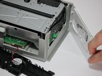 Finally remove the side panel with the ink-cartridge door by holding the right side and pulling backwards with the left side.