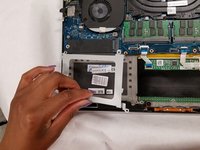 Unplug the hard drive, and remove it. (We do not have a hard drive to be shown, but see image for where the hard drive would be unplugged from.)