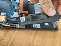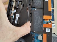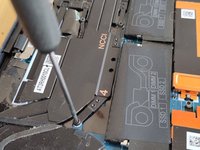 Once you have removed the cover, you can remove the battery. In order to do that, unscrew the 7 screws that keep the battery in place. Then carefully unplug the connector above the "BATTERY" label on the main board. This connector is shown with the screwdriver on the photo but a screwdriver is not the best tool to unplug it.