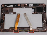 Next, you need to remove the two ribbon cables located at the bottom of the frame. To detach the first ribbon cable you need to pull straight up on the orange connecter.