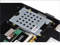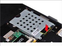 Pull the plastic tab toward the opposite end of the hard drive assembly to disengage the hard drive interposer from the connector on the system board, then lift the hard drive assembly from the computer.