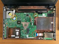 Lift the locking tab and remove the ribbon cable on the right hand lower edge of the motherboard.