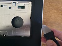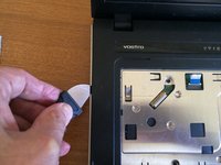 Using a small flat screwdriver or a pointed knife, remove the adhesive covers from 3 more screws in the front corners of the laptop. Remove the screws.