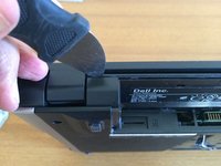 With the laptop closed, lay it upside down on the bench and remove 2 screws from the CD/DVD bay opening.
