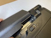 Slide the left battery release switch to the unlocked position (red showing). This is also indicated by the lock/unlock icons beside the switch.