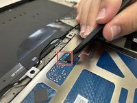 Using the small battery pull tab, disconnect the battery connector from the motherboard.