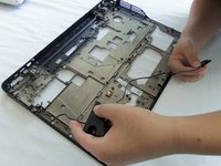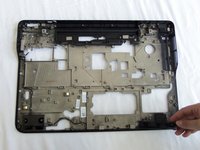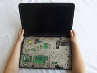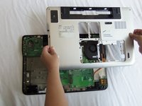Holding the opening from the optical drive in one hand with the other hand holding the opposite side of the laptop, lift and remove the back cover assembly.