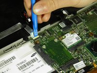 Use the plastic opening tool's angled edge to remove the black and white wires connected to the wireless WLAN card.