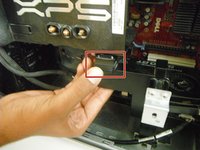Remove the cover panel on the side of the computer by pulling out the latch on the back panel and pulling the panel downwards towards the ground.