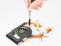 First, unscrew the six screws that are holding down the fan and heat sink with a Philips #1 screwdriver. Then use a Phillips #1 to remove the single screw near the bottom of the heat sink.