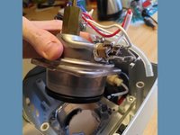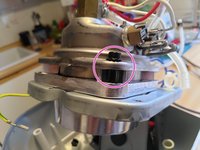 Loosen up the metallic clips (marked in blue) that hold the soft tube that link the heating element ( bottom) to the steam exit hole (right). Slide the clips along side the soft tube and remove the tube