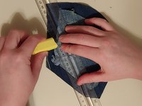 Trace vertical and horizontal lines on denim by using a straight edge and some chalk.