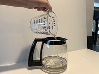 Fill the coffee maker's glass carafe with 6 cups of cold tap water and 6 cups of distilled white vinegar. Do not mix.
