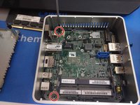 Coloxa la NUC boca abajo y comienza usando un destornillador de cabeza Phillips para quitar los tornillos inferiores en la puerta de la caja inferior.