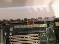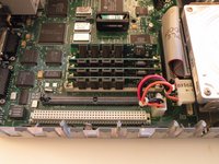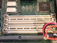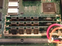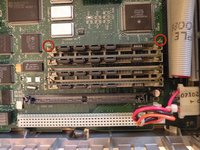 Comienza con este SIMM. Empuja estas 2 pestañas de metal hacia afuera, luego empuja la Ram hacia adelante. Entonces se puede levantar. Debes quitar los SIMM en orden, comenzando por el que acabas de quitar. A continuación, puedes continuar con los siguientes.