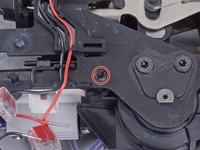 With the pick tool still inserted, pull the red main board wire out of the push-in connector.