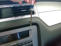 The faceplate will begin to loosen from the bottom up. After pulling out a few inches, push back inward about a half of an inch. This has the effect of a teeter/totter on the remaining top wedge pins. Now grasp the two knobs on the bottom of the panel (fan and temp) and loosen first the left side and then the right side. No real force required at any time and practically falls out. NO SCARS on the trim.