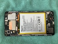 Use a mediator to un-clip the frame from the part where the screen, boards and battery sit. The mediator easily gets in close to the SIM tray. Slide it along the edges until it's unclipped everywhere. A ribbon cable connects the frame to the main board. Disconnect it and remove the frame from the rest of the phone.