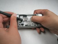 While still pressing the PUSH tab, gently press spduger into the groove between the top of the SIM card and the body. Use spudger to slide SIM card toward the PUSH tab, so that when the spudger reaches the metal cover, the card itself is depressing the tab.