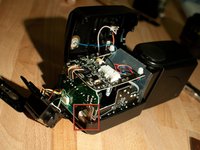 I skipped this step because I didn't feel like pulling the glue off. You should really discharge the condenser, but if you really don't want to you can minimize the risk by turning the flash on, pressing the "flash" button on the back to mostly discharge it, and turn it of before it has a chance to fully recharge. This minimizes the the risk, but I still got a pretty nasty shock even after doing this. It felt at least as bad a shock from 120VAC from an outlet.