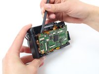 Start at the top of the camera and use the plastic spudger to pry the motherboard out of the camera.