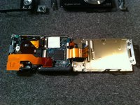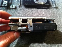 Turn the camera 180 degrees onto its other side and remove the two small screws on either side of the silver panel.