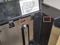There are three clips on the side of the water tank. Two of them are marked in the first picture. The third clip is to the left of the two clips.
