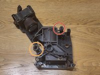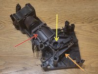 Now put on the bar (orange circle, Fig. 2). Pay attention to the two small pins (yellow circles, fig. 3). These must be inserted into the holes in the housing. There is only one correct position. Turn the bar 180 degrees and you'll see that the tiller is in the housing once and once not. Select the position in which the tiller is in the housing.