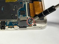 Using a plastic opening tool, lift up the latch that secures the left side of the motherboard to the screen's ribbon cable.