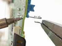 Secure the motherboard with helping hands or a similar tool so that the potentiometer solder joints face up.
