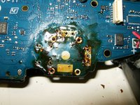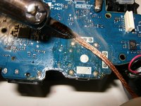Once all the contacts are desoldered, the old joystick can be removed. This may take a bit of practice since all the solder will have to be removed. It does help to pull a bit on the joystick while melting the solder and using the wick.