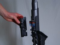 Locate and push the grey button (where the index finger is pointing) while simultaneously pulling up on the handle.
