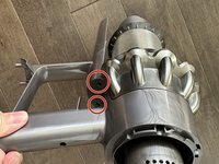 Use a Phillips #1 screwdriver to remove the two 16.5 mm screws under the middle of the vacuum, in front of the handle.