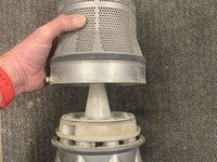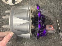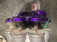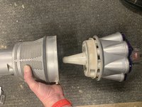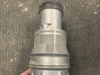 This is a brief guide on how to remove the DC17's canister and clean its cyclone assembly. If a DC17 filter is loading with more fines and hair debris than usual or struggling to make vacuum as noted by the noise the DC17's motor emits, it may be because a portion of the cyclone's internal assembly is blocked. If portions of the cyclone assembly are blocked, the remaining open portions will encourage air to pass at a higher velocity, which keeps debris suspended until it hits the filter further downstream. Following these steps will clean the cyclone's internal channels and allow debris to once again fall out inside the canister.