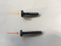 The red arrow points to the type of torx screws that hold the motor in place while the orange arrow points to the type that hold the orange ball together.