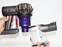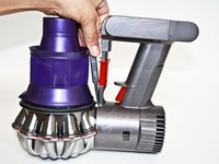 Push the red lever downward again while pulling the clear bin away from the main body of the Dyson vacuum.